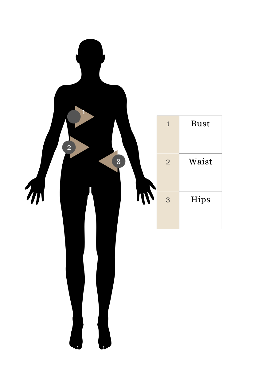 1. Bust: raise your arms and placing a tape measure underneath, lower your arms and measure all the way round the fullest part of your chest.