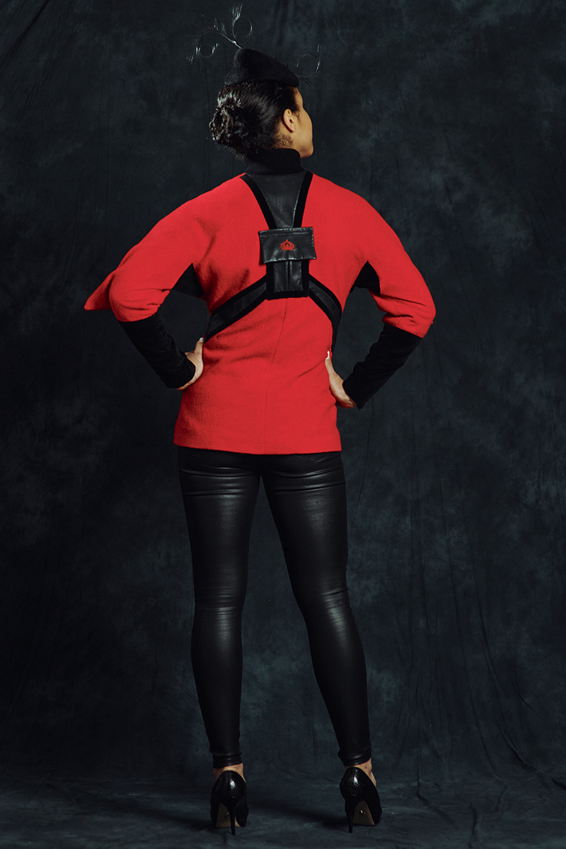 I also wanted that when the wearer walks away the conversation continues to flows from the front of the jacket to the back, so the house from the painting became a mini pocket and the faux leather edge finished with velvet became the rivers. The embroidered emblem a crown on the pocket flap, salutes our Queendom.